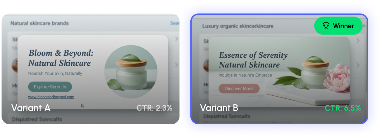 Variant B outperformed by +185% after testing across 50000 impressions